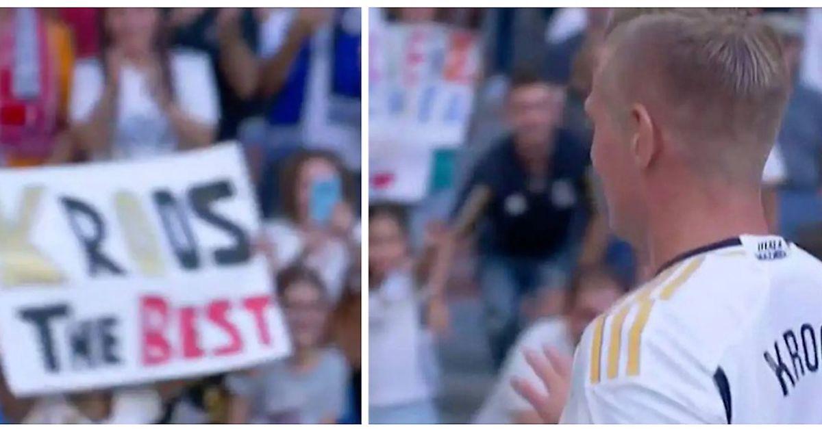 📸 В трансляцию попало милое взаимодействие Крооса и юного фаната «Мадрида». Мальчик держал плакат, посвященный Тони