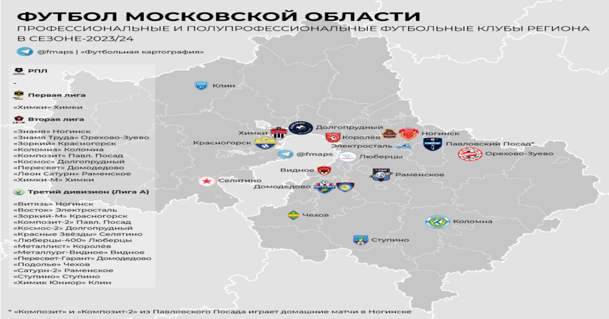 Для разнообразия я добавил полупрофессиональные/любительские клубы высшей лиги третьего дивизиона для разнообразия покрытия территории, так как почти все профессиональные клубы сосредоточены в городах непосредственно вокруг Москвы.