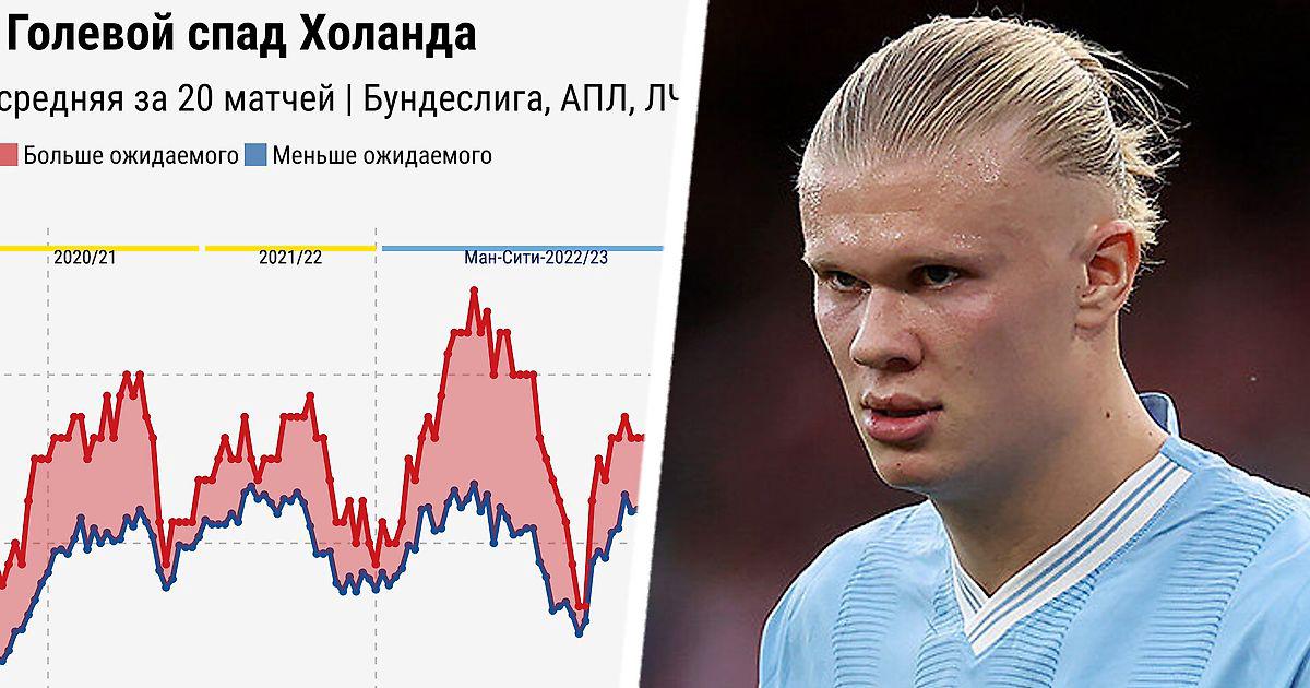 Главный вывод – впервые в карьере Холанд забивает меньше ожидаемого. Обычно его реализация – одна из лучших в мире, а сейчас он завершает моменты хуже, чем в среднем это делают другие футболисты.