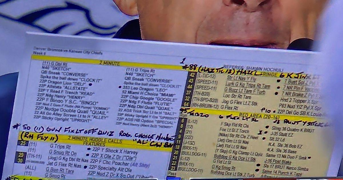 В трансляцию матча «Канзас-Сити» — «Денвер» попал крупный план плейчарта главного тренера «Бронкос» Шона Пейтона.