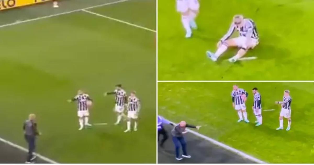 Фанат выбежал к боковой линии и начал выкрикивать свои претензии вингеру «красных дьяволов» — мужчина был уверен, что футболист симулировал. Бруну Фернандеш и Кристиан Эриксен удивленно наблюдали за этой картиной, требуя убрать незваного гостя с поля.