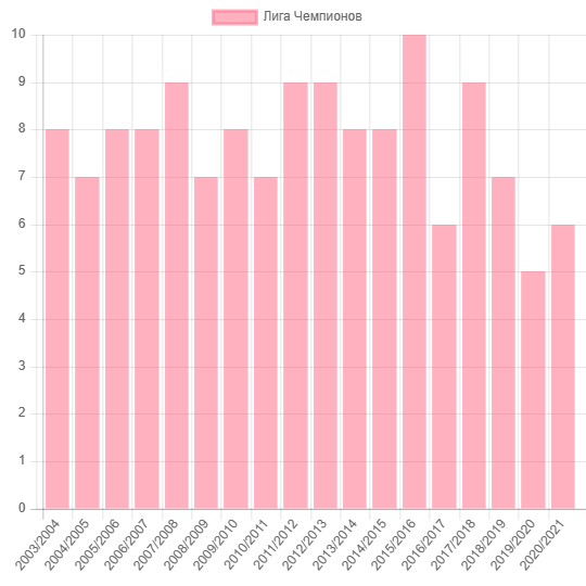 С 2003 по 2020 год в плей-офф неизменно выходили представители Испании, Франции, Англии, Италии и Германии. В большинстве случаев - еще и Португалии. Чаще всего в 1/8 финала оказывались представители восьми стран. Как видно из диаграммы, так было в шести сезонах. Но и здесь есть "разброс", и довольно существенный.