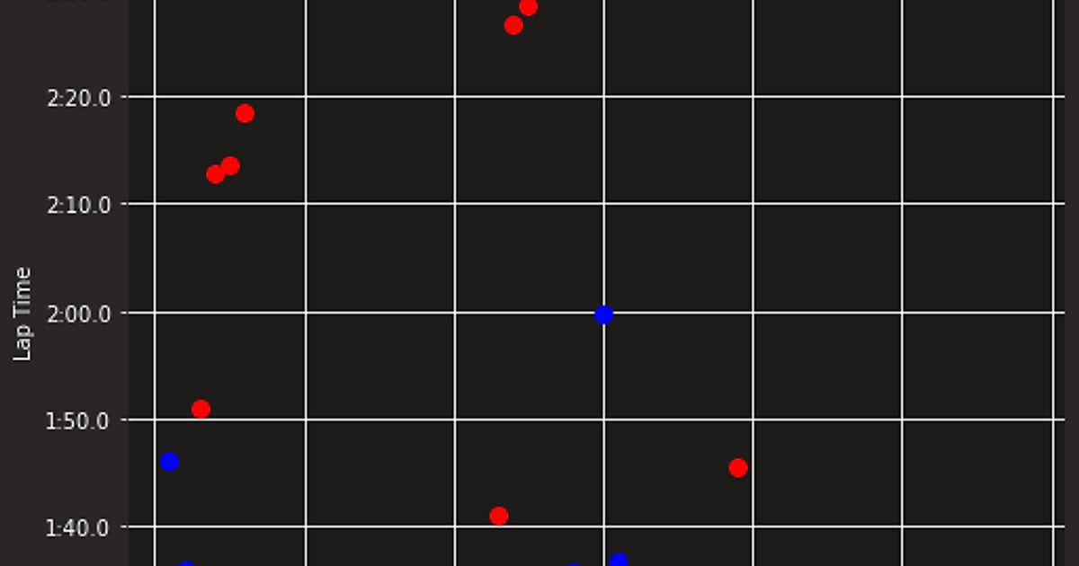 По оси x отложим номера кругов, а по оси y времена показанные гонщиками. Синим цветом обозначим время Герхарда Бергера, а красным Джорджа Рассела.