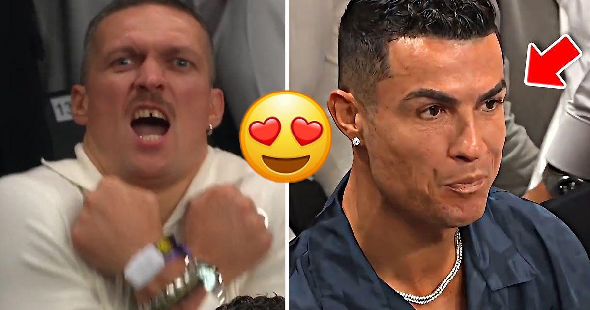 Перед началом боя на большом экране показывали всех звезд, которые приехали на супер ивент. Усик и Роналду как раз сидели рядом, поэтому их показали по очереди, сначала украинца, потом португальца.