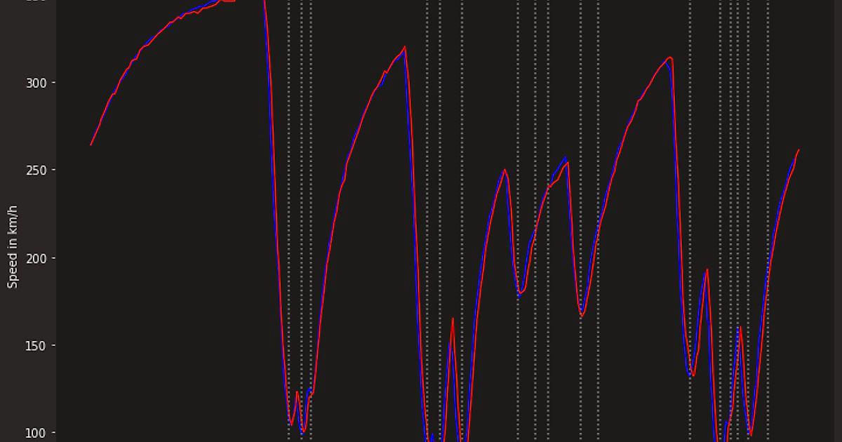 По оси у- отложена скорость каждого гонщика, по оси х - отложена дистанция трассы. Вертикальными линиями показаны номера соответствующих поворотов. Синим цветом показан график скорости - Макса Ферстаппена, а красным соответственно Шарля Леклера.