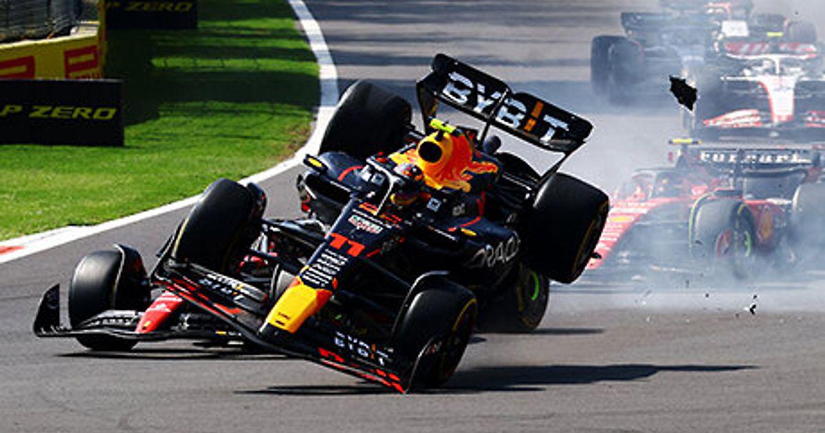 – Оба «Ред Булл» стартовали лучше всех (0,23 у Переса и 0,28 у Ферстаппена) – Ферстаппен выиграл внутреннюю траекторию, Перес атаковал по внешней и срезал Леклера, сломав «Феррари» переднее антикрыло! Серхио откатился на последнее место и сошел.