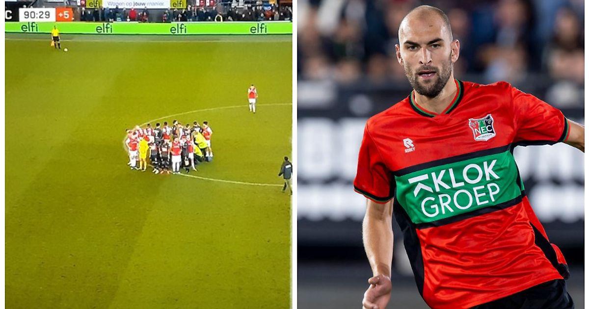 На 90-й минуте матча «АЗ» пошел в атаку, форвард «НЕКа» возвращался назад, а затем рухнул на поле прямо в центральном круге.