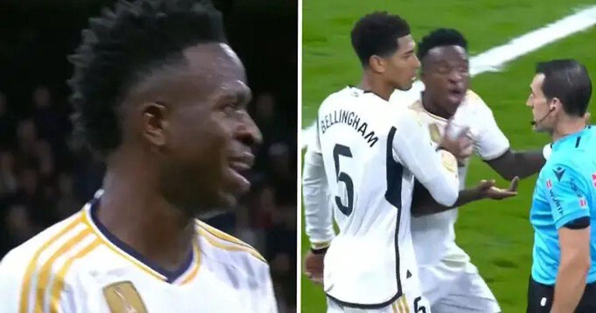 Беллингем на мгновение уступает, и Вини снова провоцирует арбитра.