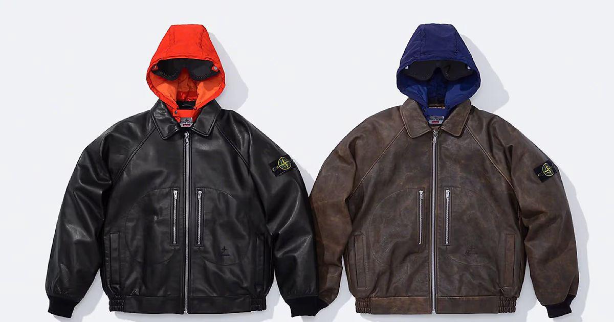 Самая заметная модель коллекции — конечно, кожаная куртка с очками. В первой коллаборации Stone Island x Supreme 2014 года уже появлялась куртки с очками, такие модели бренд выпускал в конце 80-х годов. Интересно, что среди фанатов Stone Island эти куртки известны под никнеймом Helicopter Jacket.