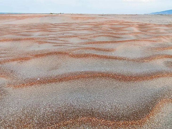 Этот пляж интересен с точки зрения песка. Здесь он не совсем обычный. Его цвет почти черный вулканического происхождения. Широкая береговая линия и чистая вода, а также песок без камней при входе в воду привлекает сюда туристов, которые приезжают из Дербента. Расстояние около 30 километров, которое придется преодолеть. Дорога до пляжа грунтовая. В поселок ходит электричка. Однако потом придется топать почти 7 километров, поэтому автомобиль или такси будет лучшим вариантом. Многие приезжают сюда, чтобы пожарить шашлык и отдохнуть семьями.