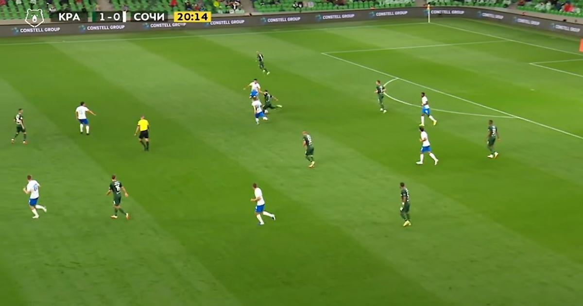 После потери Сочи мяч от защитника Краснодара получает опорник Крыховяк в центральной зоне. Следует передача в полуфланг инсайду.