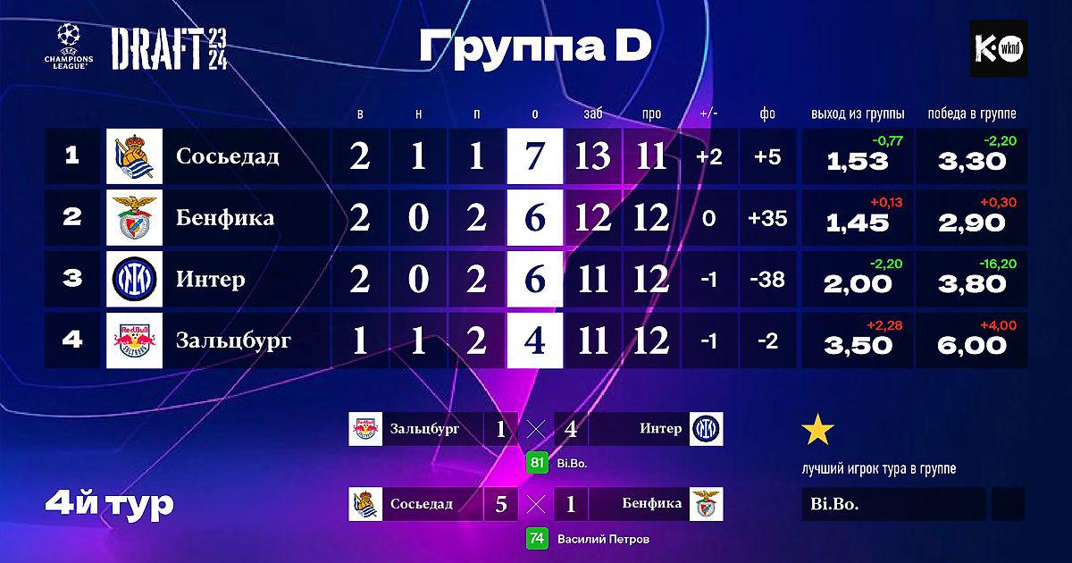 Три интересных факта группы: 1. Flashback в этот раз остается вообще вне игры, но это не мешает его парням взять топ-4 результат в туре. 2 победы над Зальцбургом и вот у Интера уже замечательные шансы на плов 2. Реал Сосьедад прямо здесь и сейчас творит историю, обыграв Бенфику и не дав ей выйти из группы уже сейчас 3. Madridist08 пикает и кэпит! лучший пик тура - Морату, вот это сила, красава