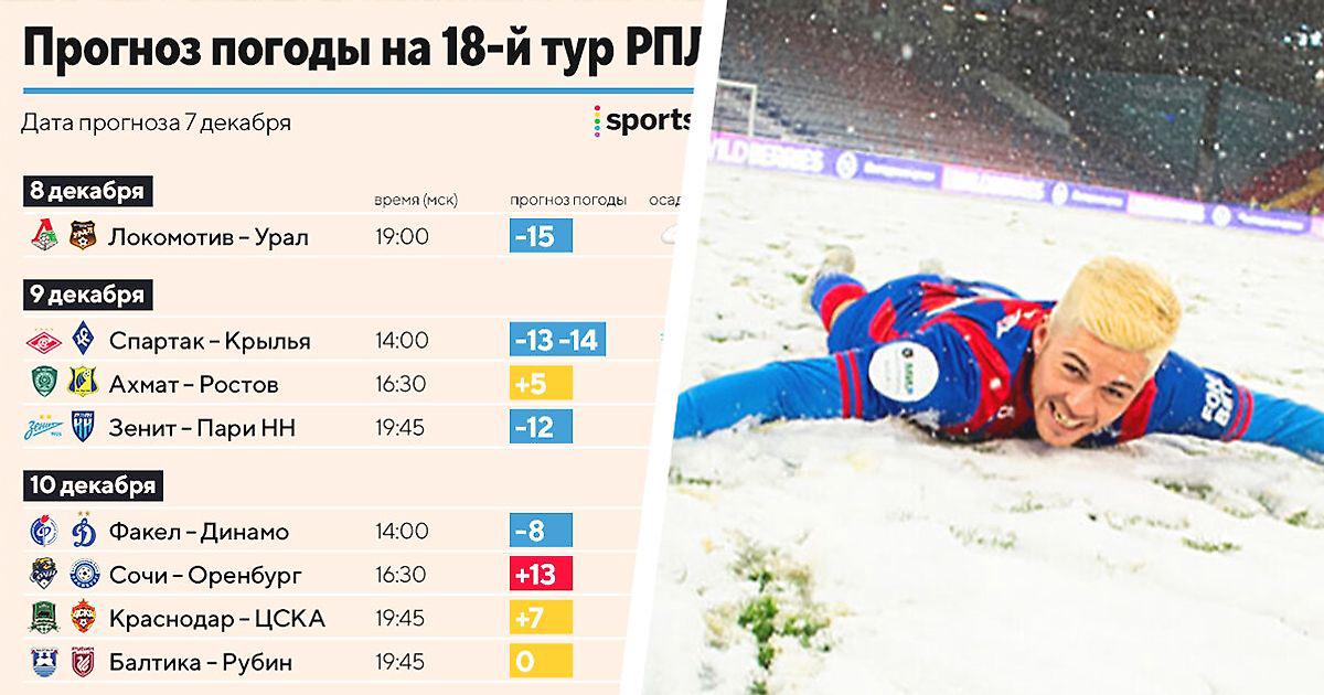 В Калининграде (где «Балтика» примет «Рубин») к 18-му туру ожидается около нуля, но с дождем и снегом. Вряд ли это помешает ТВ-картинке больше, чем снегопад, но на качестве футбола наверняка тоже скажется.