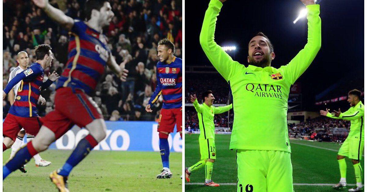 Жереми Матье вколачивает «Мадриду» после подачи со штрафного – Суарес и остальные бегут поздравлять француза с долгожданным голом, но Лео и Ней радуются отдельно.