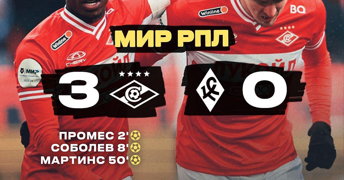 Красно-белые забили два гола в начале встречи — на 2-й минуте отличился Квинси Промес, на 8-й минуте отметился Александр Соболев. На 50-й минуте Кристофер Мартинс сделал счет крупным.