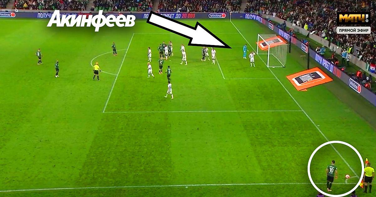 И это было очень хитро! Пока игроки готовились к угловому, Сперцян заметил разбегающегося Кривцова – и исполнил передачу чуть раньше, чем этого ожидали игроки в штрафной площади. Акинфеев, например, в этот момент спокойно шел к воротам, как видно на скриншоте ниже.