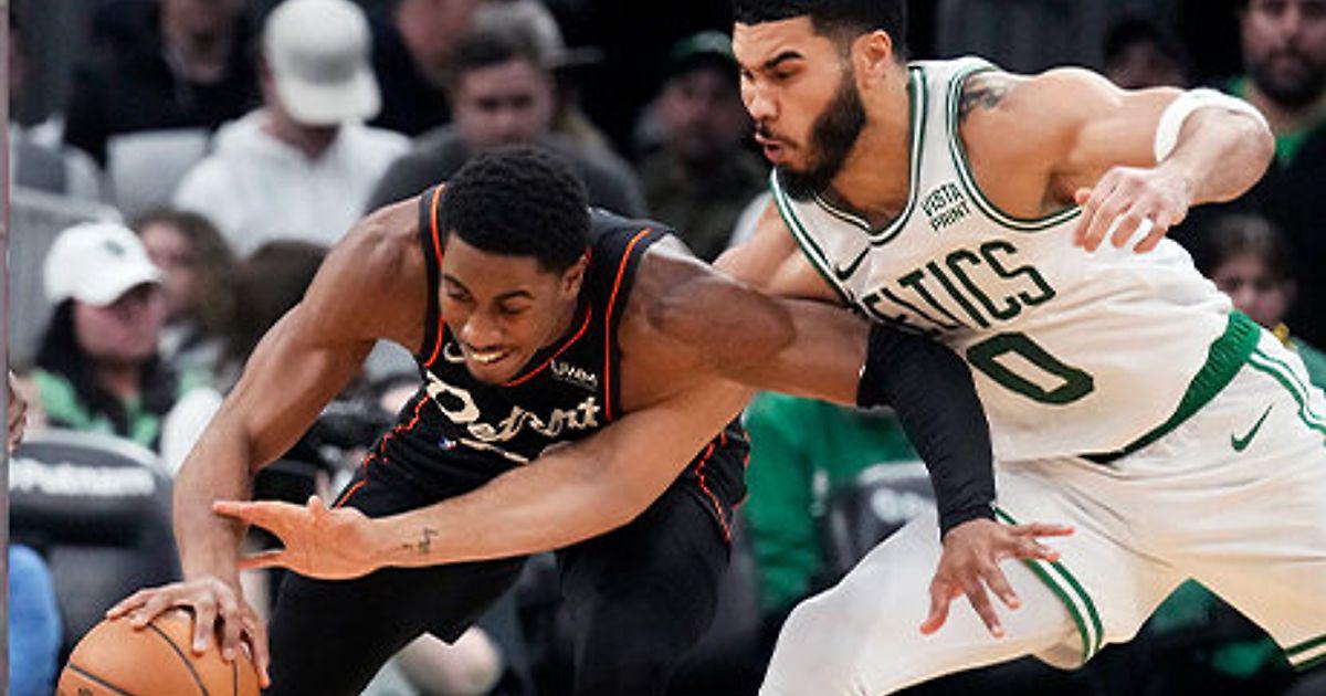 Джейлен Браун, получивший коленом в поясницу от Леброна в прошлом матче, игру пропускал, а все остальные звезды «Бостона» были в строю. Однако, несмотря на это, с самого начала матча «Детройт» смотрелся на равных с основным претендентом на титул, выиграл борьбу за подборы, превзошел по очкам второго шанса, отказался от привычных потерь и показал, что не готов к очередному проигрышу. Особенно хорош был Кейд Каннингем, благодаря усилиям которого гостям удалось забрать первую четверть со счетом 30:27.