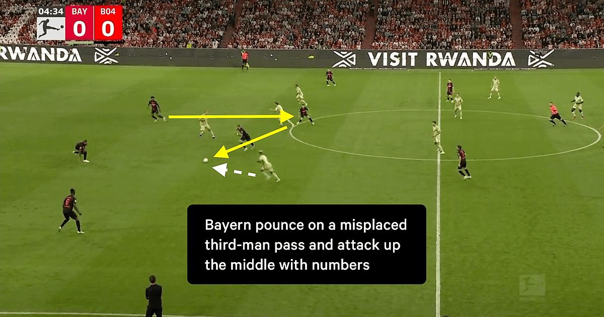 Но Леверкузен готов оказывать давление и рисковать случайными потерями в обмен на все пространство, которое их стиль открывает за линиями прессингующей команды. Даже сама угроза комбинации «на третьего» иногда выдергивала игроков «Баварии» из позиции, позволяя «Леверкузену» совершать прорывные передачи через эти пространства.