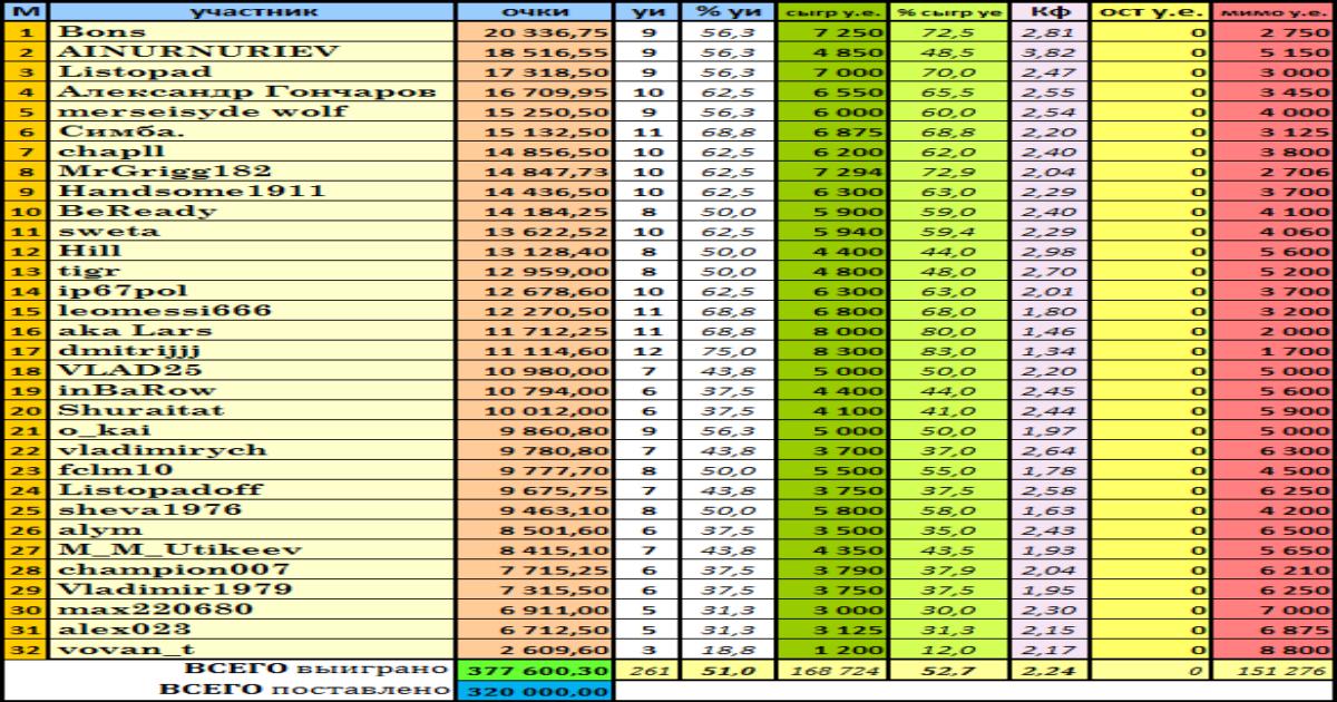 Первая победа настигла и Bons'а. Да еще какая! С лучшим результатом сезона, который в перспективе тянет на "рекорд на все времена"! AINURNURIEV с умопомрачительным средним коэффициентом сыгранных ставок - 3,82 занимает 2 место. Мне удалось в этом туре совместить максимальные ставки с угаданными исходами, что позволило показать лучший личный результат и занять 3 место!