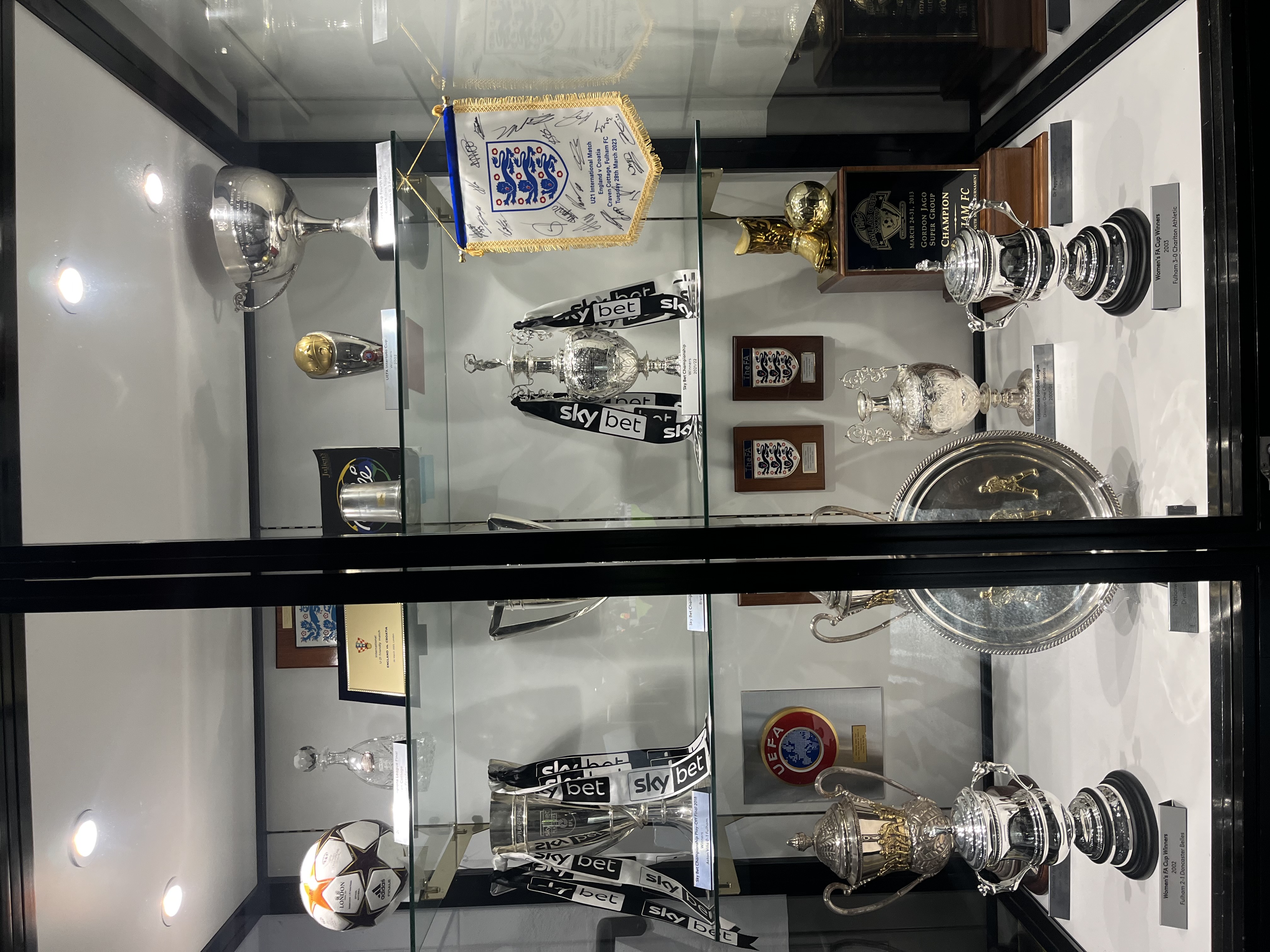 Здесь же, где-то между баром и туалетом, находится стенд с трофеями. Издалека выглядит солидно, но при ближайшем рассмотрении оказывается, что здесь в основном показаны успехи женских или молодежных команд, а также победы в низших дивизионах. Что ж, каждому нужен повод для гордости.