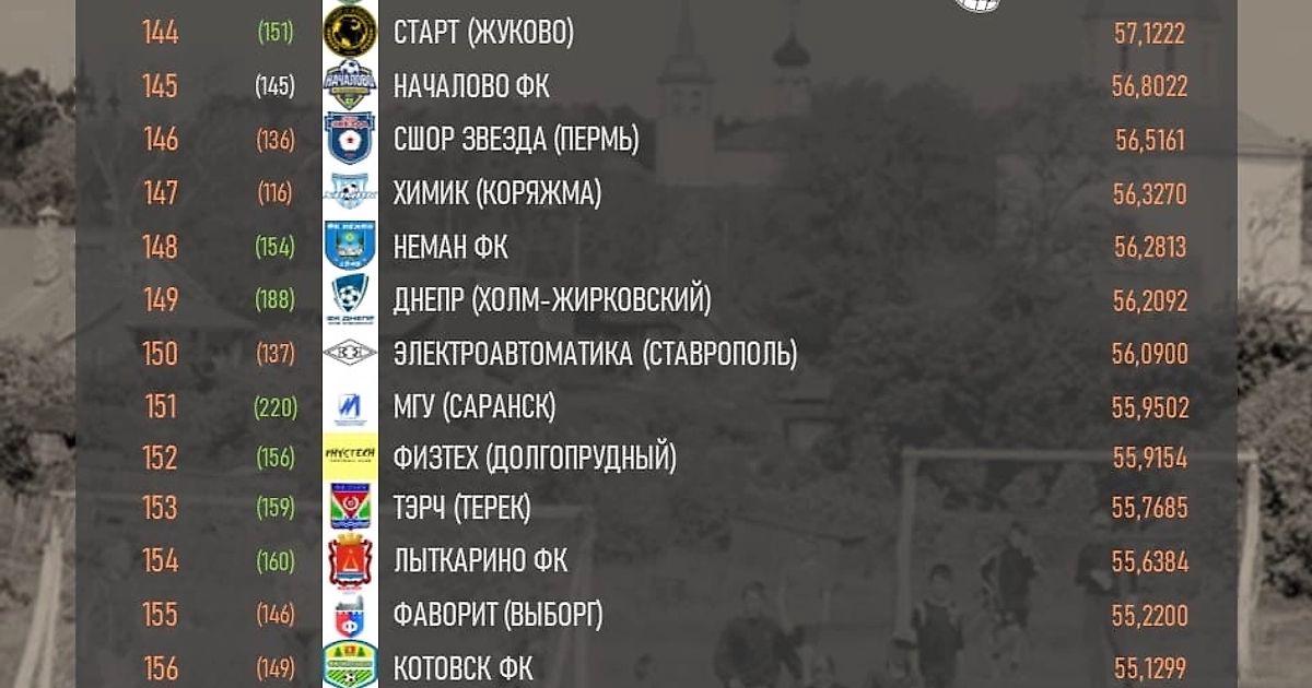 Из самых шустрых в этой двадцатке - это туймазинский Спартак, холм-жирковский Днепр, саранский МГУ и Жасмин из Михайловска. Да и в целом - очень интересные имена у команд пошли во второй сотне клубов.