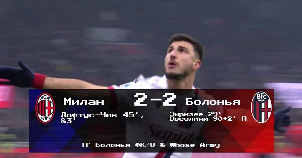 В отсутствие Жиру бил с точки Эрнандес, но угодил в штангу, успел на добивание первым и пропихнул мяч в сетку. Судья не засчитал: стряхнул пыль с редкого правила, по которому бьющий стандарт футболист не имеет права добивать мяч после его отскока от каркаса ворот. «Милан» было уже не остановить: в последние 15 минут матча хозяева больше владели мячом и стремились победить. В ситуации со вторым голом «Болонью» вновь подвел левый фланг. Почти идентичный гол с застрявшим в лимбе Салемакерсом в роли Урбаньского и завершением от Лофтус-Чика, причем в центре штрафной не оказалось никого, кто мог бы помешать англичанину нанести сильный удар головой. У «Болоньи» почти не оставалось времени, но команда Мотты сумела выжать максимум из одного эпизода. Свежий Орсолини прострелил на дальнюю штангу, где вбегавшего замыкать Кристиансена схватил за майку Терраччано. Пенальти — третий в этом матче — на счастье гостей реализовал Орсолини. Матч выдался ярким, было много как красивых, так и неоднозначных эпизодов и решений. Суммарно на двоих у команд набралось девять явных голевых моментов (к которым относятся и 11-метровые). «Милан» не очень эффективно проникал в чужую штрафную через пас, но хорошо использовал кроссы с правого фланга для доставки мяча в опасные зоны. «Болонья» отчасти отказалась от своего футбола, однако впервые за долгое время смогла забить на «Сан-Сиро» больше одного. «Милан», включаясь в игру, выглядел очень ярко, «Болонья» в свойственной себе прагматичной манере сумела в меру своих возможностей угомонить «дьявола» в его логове. Итоговая ничья может кого-то не устроить, но нейтральному зрителю, уверен, этот матч смотреть было очень интересно.