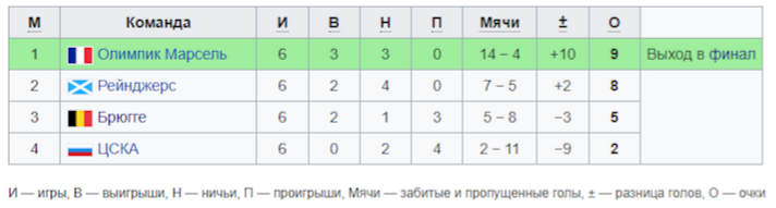 Что ещё можно сказать? Можно рассказать про итоги. Первое и второе место занял «Олимпик Марсель» и «Рейнджерс», оба этих клуба ни разу не проиграли на групповом этапе. Третье место занял «Брюгге», набрав 5 очков (по двухочковой системе). ЦСКА занял последнее место с разницей мячей 2-11 и с двумя ничьими: в третьем туре против «Олимпик Марсель» и в шестом против «Рейнджерс».