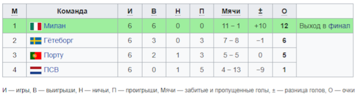 Вкратце расскажу про итоги. «Милан» сделал 6 побед из 6 и спокойно вышел в финал против «Олимпик Марсель». «Гётеборг» занял второе место с 6 очками и отрицательной разницей мячей. Третье место досталось «Порту» с разницей мячей 5-5 и 5 очками. Последнее место занял ПСВ всего с одним очком (ничья в первом туре против «Порту») и с разницей мячей -11.