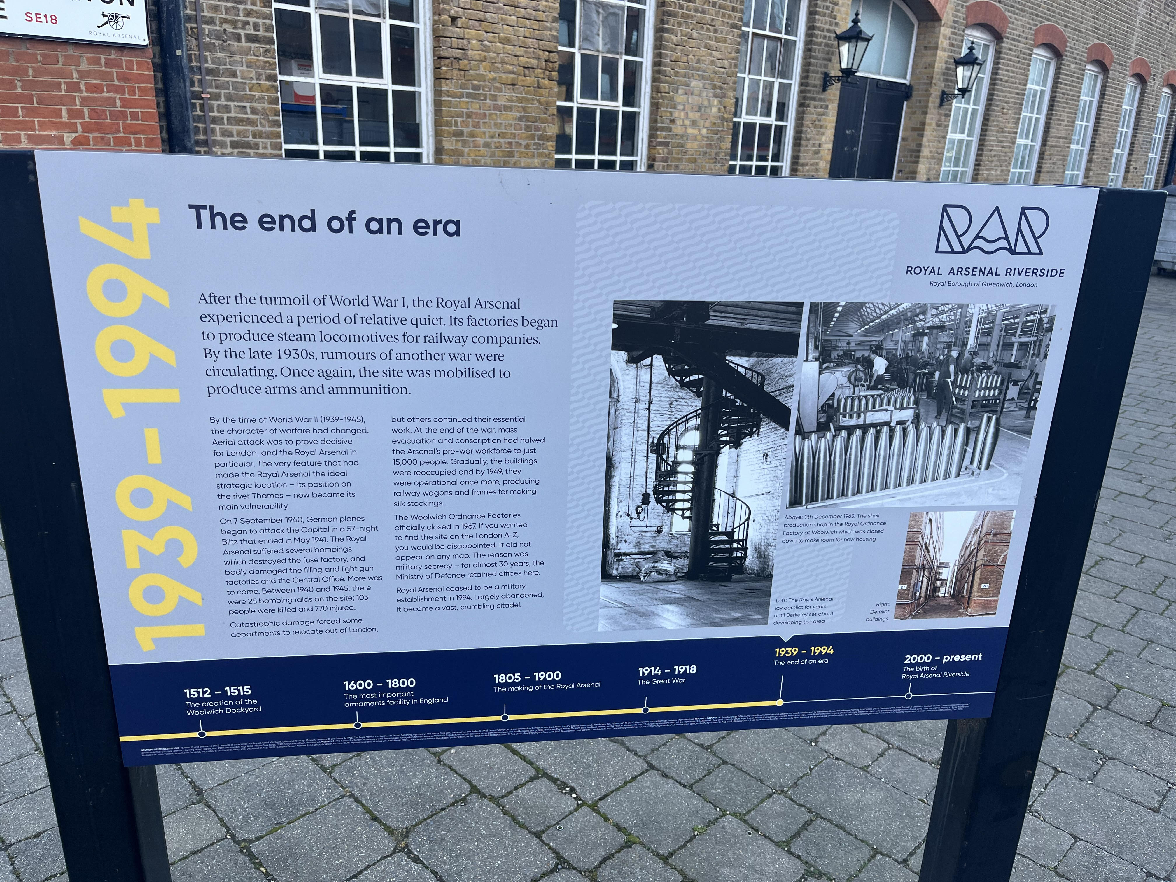 На улицах расставлены стенды с рассказами о разных эпохах Royal Arsenal. Англичане бережно относятся к своей истории.