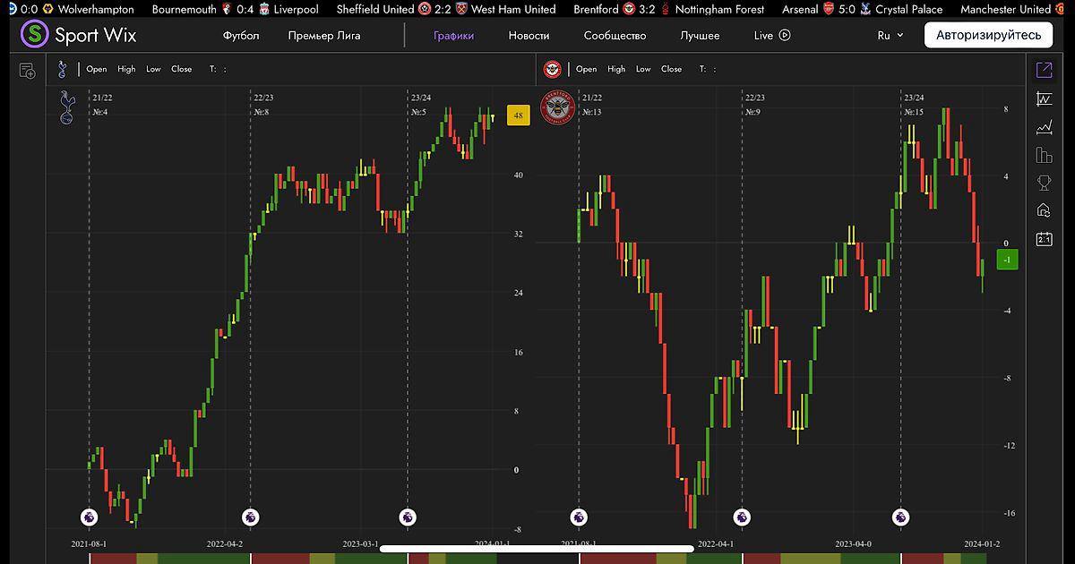 Тоттенхэм перед игрой 22 тура занимает 5 строчку турнирной таблицы и может сравняться по очкам с Астон Виллой, для этого необходимо выиграть у Брентфорда. Давайте сравним их динамику результативности в текущем сезоне.