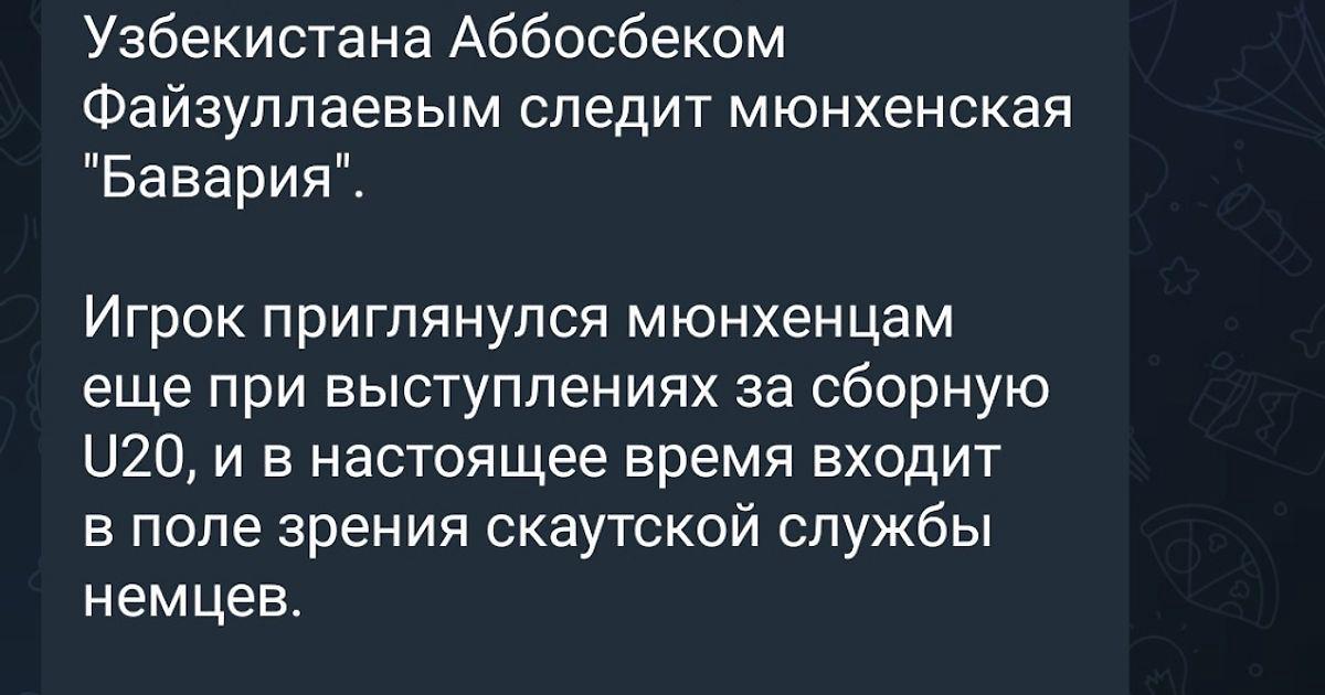 «По поводу интереса «Баварии» к Файзуллаеву я пока ничего не знаю. Если мюнхенцы следят за ним, то это говорит о его уровне, но ему важно проявить себя не только в нескольких отдельных матчах, но и на протяжении нескольких сезонов. После этого можно будет серьёзно обсуждать интерес к игроку не только от «Баварии», но и других больших клубов. Заметно, что Аббосбек обладает хорошими качествами. Он футболист, который сразу попал в основной состав ЦСКА, приехав из Узбекистана. Он сразу стал демонстрировать высокий уровень. Если так и продолжит, то я уверен, что у него будет много предложений из других стран», — сказал Олич.