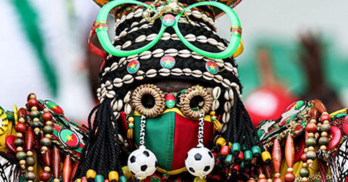 Вот фанат Буркина-Фасо, почти полностью увешанный бусами и другими цветастыми атрибутами.