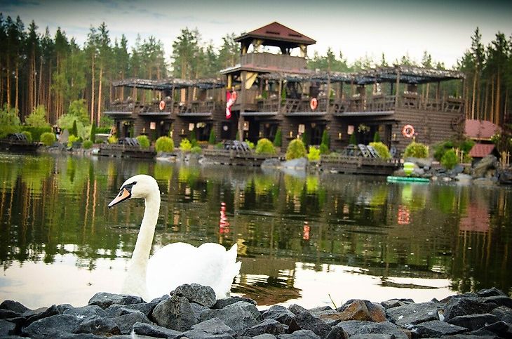 Гости могут арендовать деревянные домики, которые построены на берегу озера. В местном озере живут лебеди. Береговая линия обустроена пирсом и песчаным пляжем, на котором в теплое время устанавливают шезлонги. На территории центра есть ресторан, с террасы которого открывается вид на пруд. Для проведения мероприятий есть беседки, шатры, банкетный зал. Для отдыха можно использовать мангальную зону, взять напрокат удочки и лодки. Работает детский аниматор.