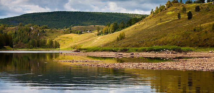 Берега реки очень живописные. Отвесные скалы переливаются в зеркале реки. На реке много рыбаков, потому что уловы здесь всегда богатые.
