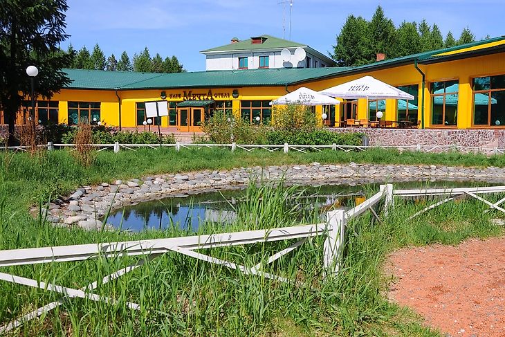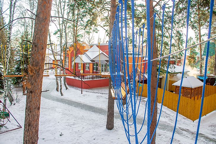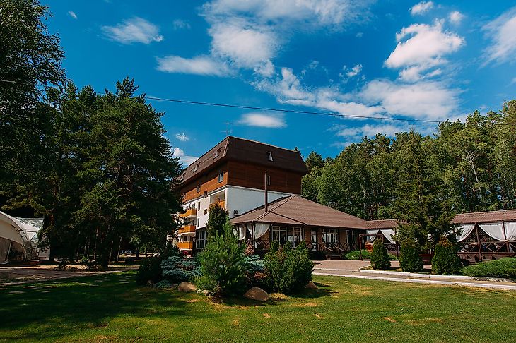 Дом отдыха находится в лесу, в экологически чистом районе Омской области, на территории можно встретить белок, которые привыкли к такому соседству и будут не против покормиться из рук отдыхающих. Для тех, в свою очередь, есть возможность поселиться в номерах семи различных категорий от эконом-класса до люкса. Но нужно иметь в виду, что номера многоместные и даже в люксе могут разместить троих отдыхающих. В летнее время «Русский лес» это санаторно-оздоровительный лагерь для детей, но и взрослые могут здесь заниматься профилактикой своего здоровья.