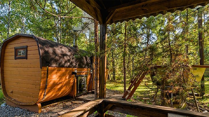 - Стоимость проживания — от 12 000 рублей в сутки за дом с камином и русской баней, но за установку палатки придется заплатить всего 500 рублей