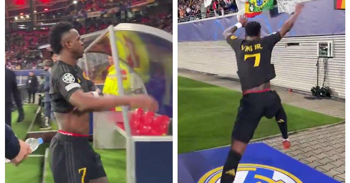 После матча с «Лейпцигом» Винисиус кинул свою футболку на трибуны, а по пути умудрился сломать эмблему «Реала» 😱