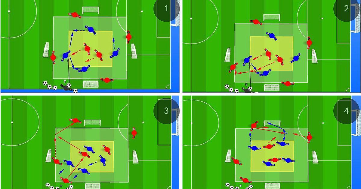 После ввода мяча в игру тренером четвёрка синих начинает удерживать мяч в малом квадрате в ситуации 4х2. Двое красных, в случае отбора мяча, стремятся моментально вывести его из малого квадрата и установить контроль над мячом уже в ситуации 6х4, задействовав игроков, расположенных на внешних линиях в большом квадрате. Синие, потеряв мяч, переключаются на отбор с целью вернуть контроль над мячом в малом квадрате. В упражнение можно добавить ворота, которые можно атаковать после выполнения каких-либо условий. В упражнении участвуют 10 игроков. Оптимальная дозировка: 4 повторения по 2-3 минуты и смена ролей в перерывах. Размеры обоих квадратов зависят от того, какая группа целевая в данном эксперименте: команда с мячом или без мяча, запланированной тренером когнитивной нагрузки, а также возраста и уровня подготовки игроков.