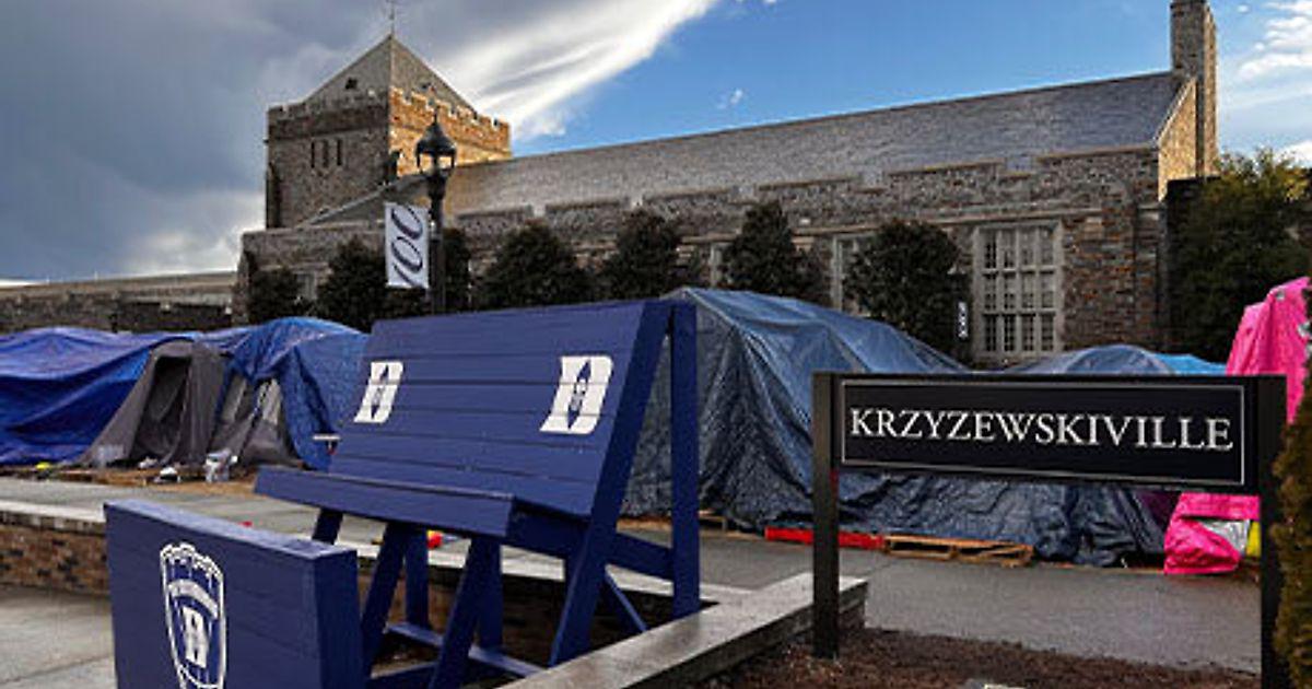 Итак, знакомьтесь, Кшишевскивилль. Назван в честь легендарного Коуча К, Майка Кшишевски, который сделал Дьюк главной силой в студенческом баскетболе и регулярным поставщиком топовых проспектов НБА. Традиция зародилась в 1986 году, когда вместо того, чтобы стоять в многочасовой очереди перед игрой, группа студентов пошла дальше и установила палатки в очереди за несколько дней до игры, чтобы гарантировать места в первом ряду.