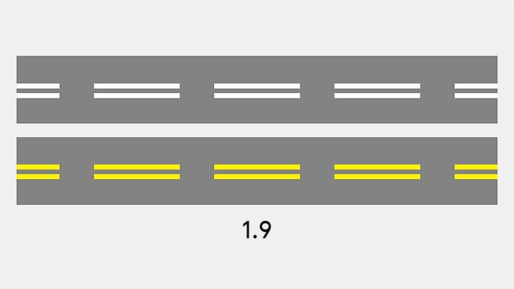 Разметка 1.9 представлена двойной чертой, длина которой в 3 раза превышает расстояние до следующей. Она отделяет границы полосы с реверсивным движением.