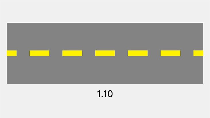 Разметка 1.10 (желтый цвет) представлена полосами той же длины, что и расстояние до следующих полос. Она используется со стороны обочины и запрещает парковку, при этом остановка (не более 5 мин.) разрешена.