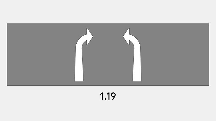 Разметка 1.19 представлена стрелками, схожими с 1.18, но с некоторыми отличиями. Подобные обозначения информируют о приближении к участку с сужением дороги. В этом случае водитель должен перестроиться в том направлении, которое определено наклоном стрелки.
