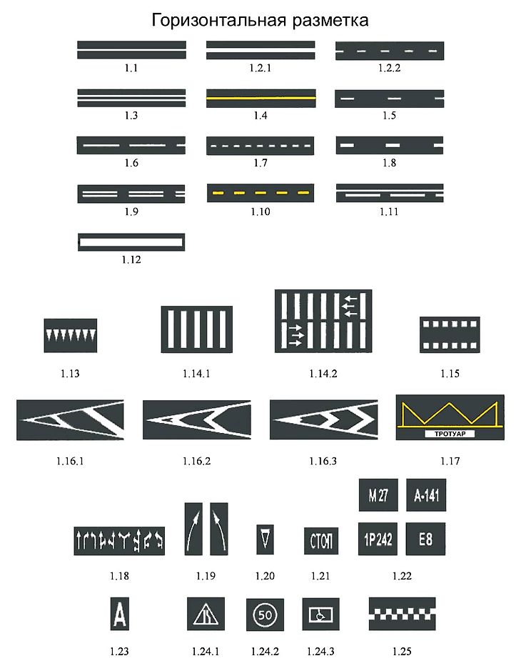 Горизонтальная разметка представлена различными линиями, знаками, буквами и цифрами, которые наносятся на дорогу. При этом она разделяется на категории, которые далее будут рассмотрены более подробно.