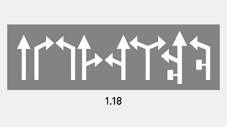 Разметка 1.18 представляет собой указатель, устанавливающий правила движения по полосам на перекрестке. Движение по ряду, где она нанесена, допустимо только в направлении, указанном стрелкой.