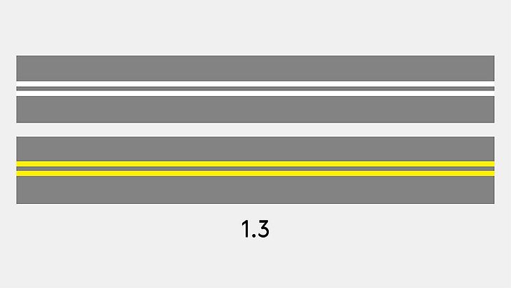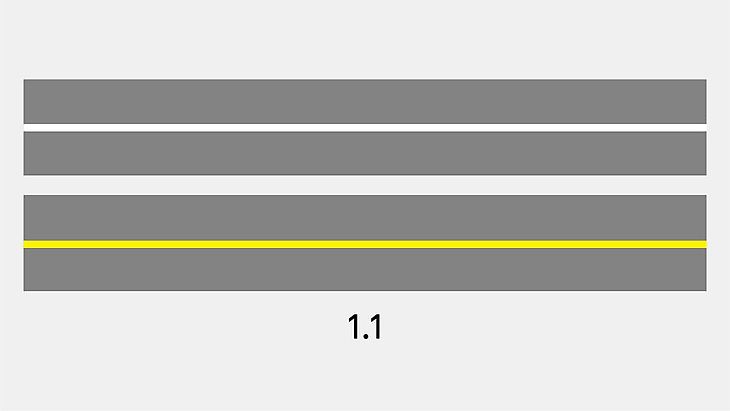 В отличие от разметки 1.1, горизонтальные линии, применяемые в разметке 1.2, имеют большую ширину и служат для разделения проезжей части и обочины. В случае, если нет иных указаний, переезжать ее для парковки разрешено.