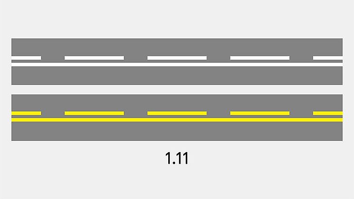 Разметка 1.11 располагается по центру дороги на участках, где пересекать полосу безопасно только в определенном направлении. Обычно речь идет о местах для обгона, поворотах налево и т. д. Разметка 1.11 позволяет совершать маневр только со стороны прерывистой линии. Пересекать сплошную можно, но только для завершения обгона.