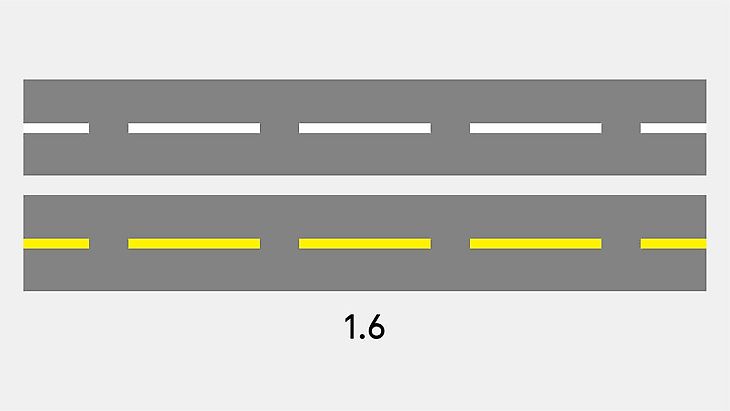 Разметка 1.6 представлена линиями, в которых каждая черта имеет длину в 3 раза превышающую расстояние до следующей. Она информирует о скором завершении прерывистой линии, поэтому опережение и обгон недопустимы. А если маневр уже был начат, он должен быть завершен до перехода прерывистой линии 1.6 в сплошную.