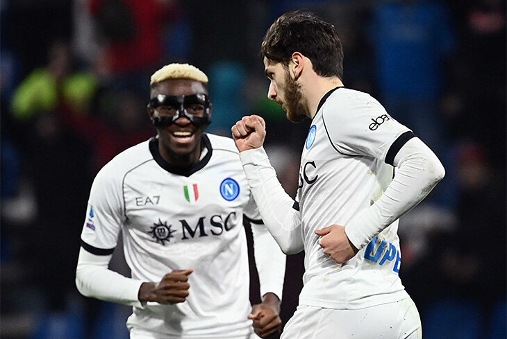 В принципе, в себя «Наполи» в последнее время приходит — в семи предыдущих баталиях чемпионата лишь один провал. А в минувшую среду сыграл пропущенный матч 21 тура, и сделал это на выезде против тонущего «Сассуоло». Где вполне напомнил себя прошлогоднего, разорвав хозяев в клочья с теннисным исходом при помощи хет-трика восстановившегося Осимхена и дубля проснувшегося Кварацхелии — 6:1.
