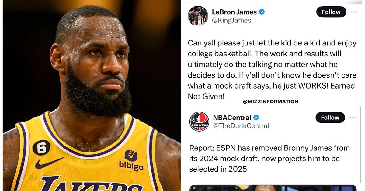 Сын суперзвезды НБА Леброна Джеймса выпал из драфта-2024 (по версии ESPN). Эксперты перенесли Бронни на драфт-2025, что запустило очередную волну насмешек. Леброн поддержал сына, но вскоре удалил пост.