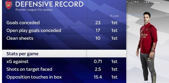 В эфире «Monday Night Football» Джейми Каррагер высоко оценил оборонительные качества «Арсенала», назвав их лучшими в Европе. Он утверждает, что это дает «канонирам» серьезные преимущества в борьбе за чемпионство Премьер-лиги. Однако, Тьерри Анри выразил опасения относительно их способности защищать свою штрафную зону. Несмотря на то, что «Арсенал» находится на третьем месте после «Ливерпуля» и «Манчестер Сити», их оборонительные показатели в этом сезоне превосходят все остальные команды: у них наименьшее количество пропущенных голов и наибольшее количество матчей без пропущенных голов в лиге.Команда Микеля Артеты также занимает первое место по количеству ожидаемых голов в ворота, бросков в створ и касаний соперника в штрафной соперника.